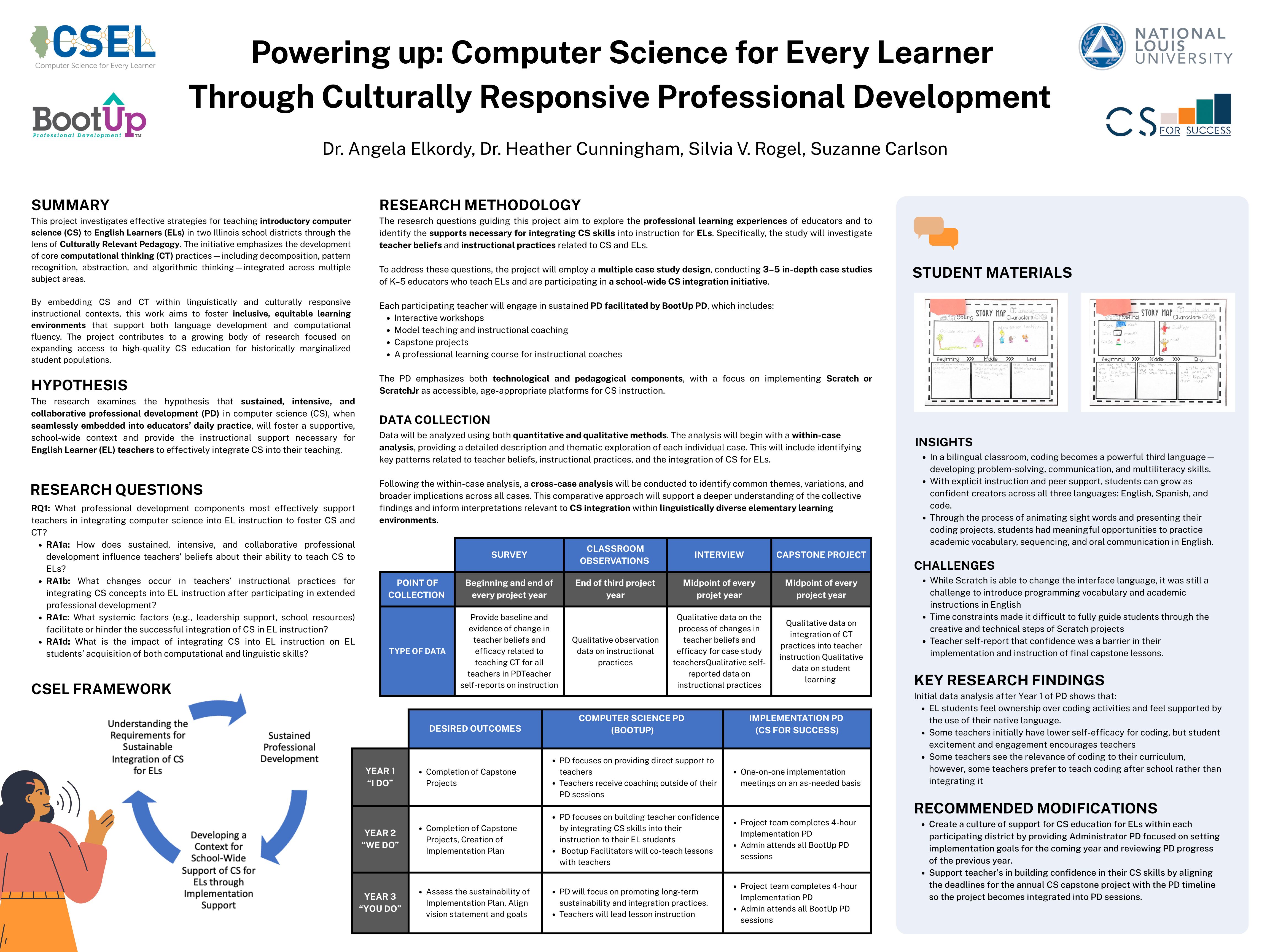 In collaboration with CS for Success and National Louis University, BootUp is excited to present our research project “Powering up: Computer Science for Every Learner Through Culturally Responsive Professional Development.” This project is aims to enhance knowledge on teaching introductory computer science (CS) to English Learners (ELs) effectively in two Illinois school districts. Supporting and developing key concepts in CS and computational thinking (CT) embedded across various subject areas, this project seeks to support inclusive and comprehensive learning for ELs.