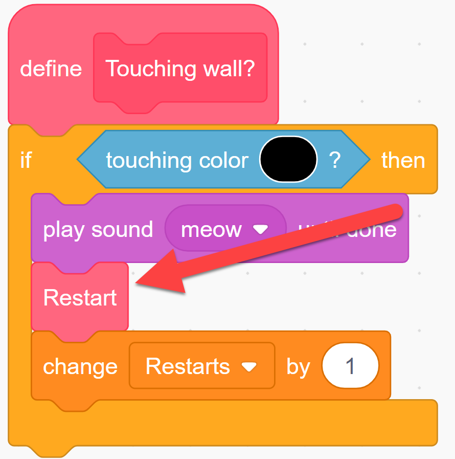 Why does Scratch cat meow when touching the wall but never restarts to the beginning of the level?